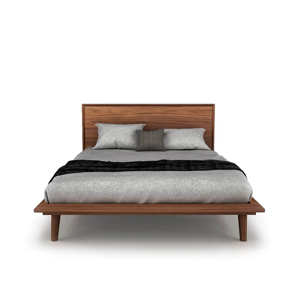A supportive slat system eliminates the need for a box spring. The low, streamlined profile emphasizes wood tone and creates a calm focal point in the bedroom.