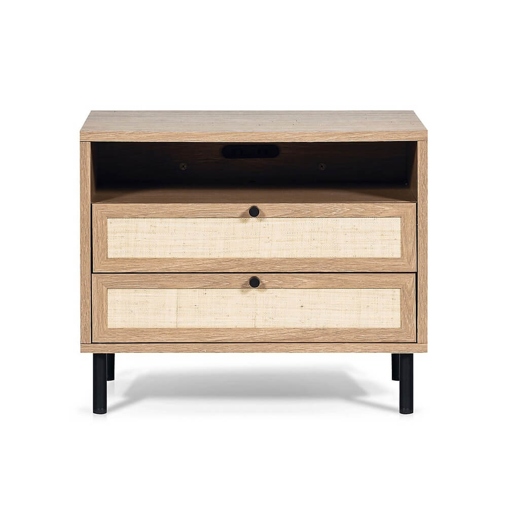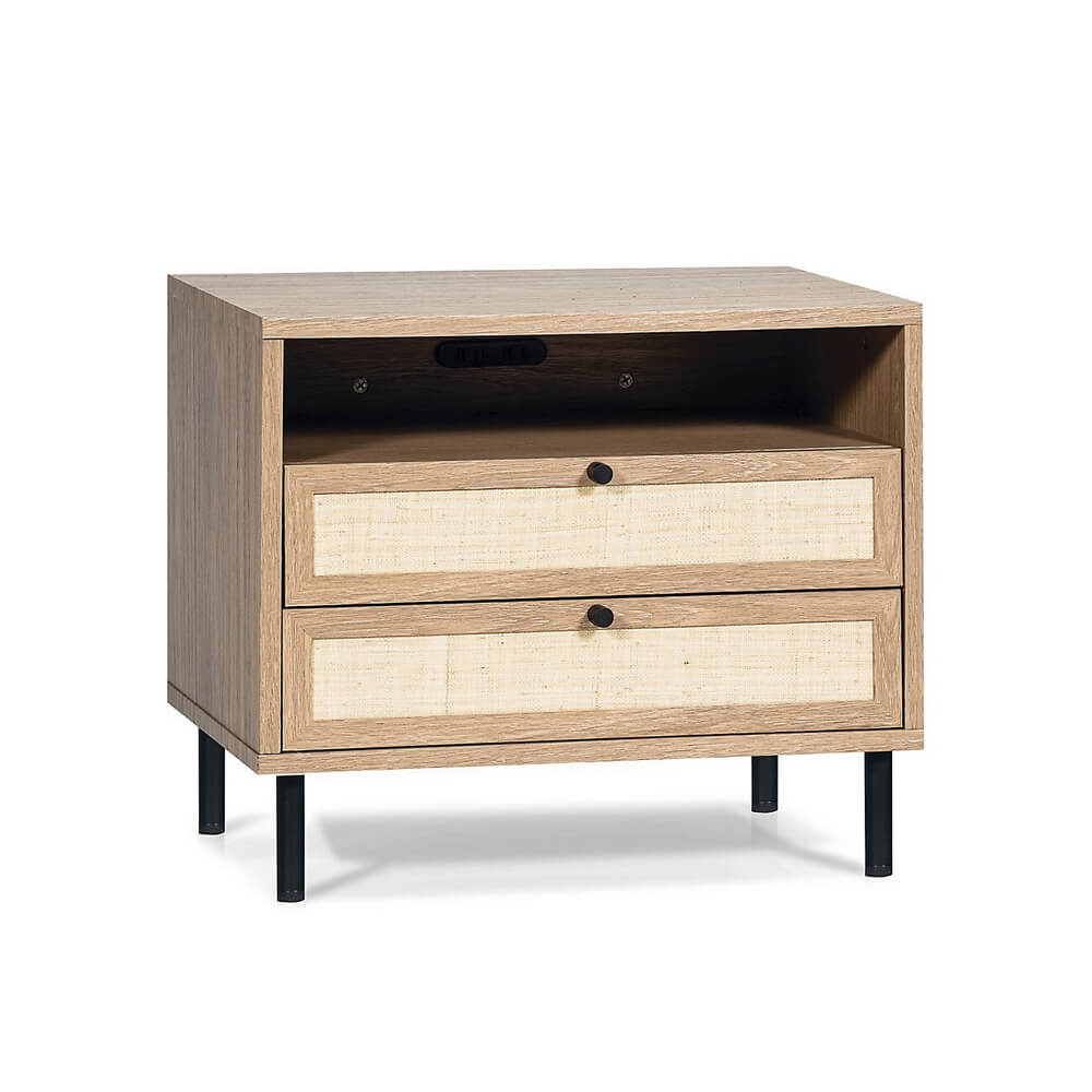 Two drawers keep essentials close at hand, while an open shelf offers space for books or a charging tray. Soft‑close hardware and easy‑grip pulls support daily use.